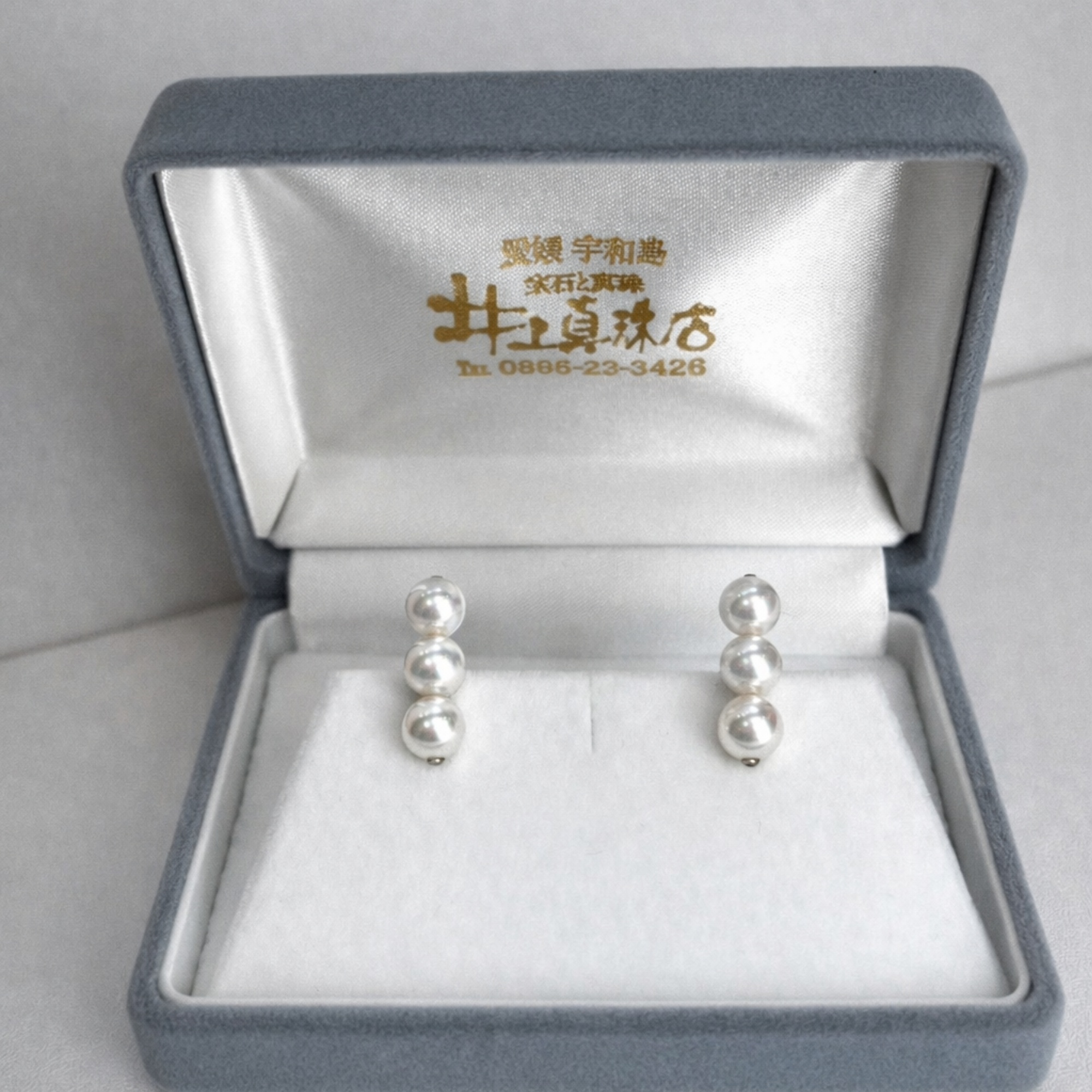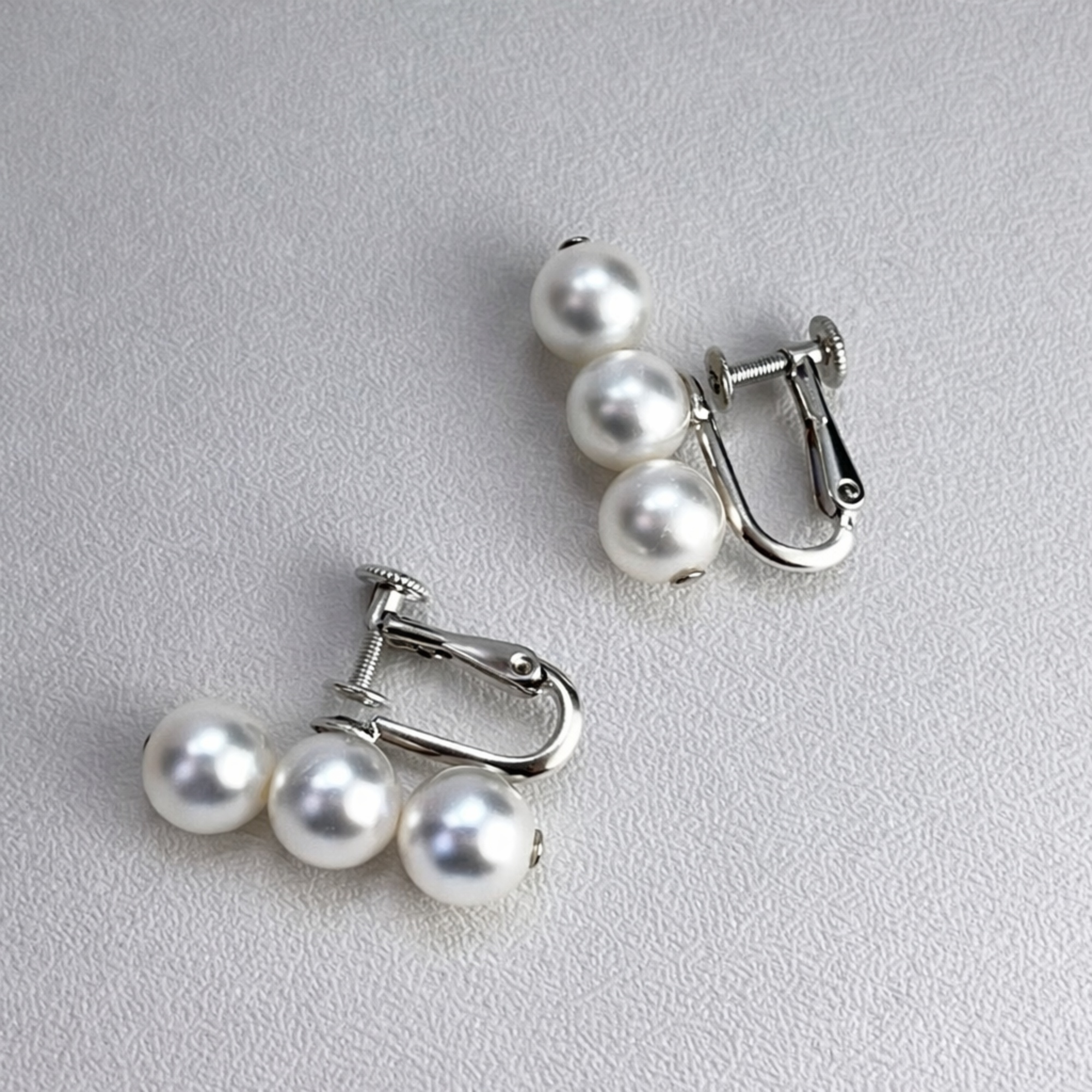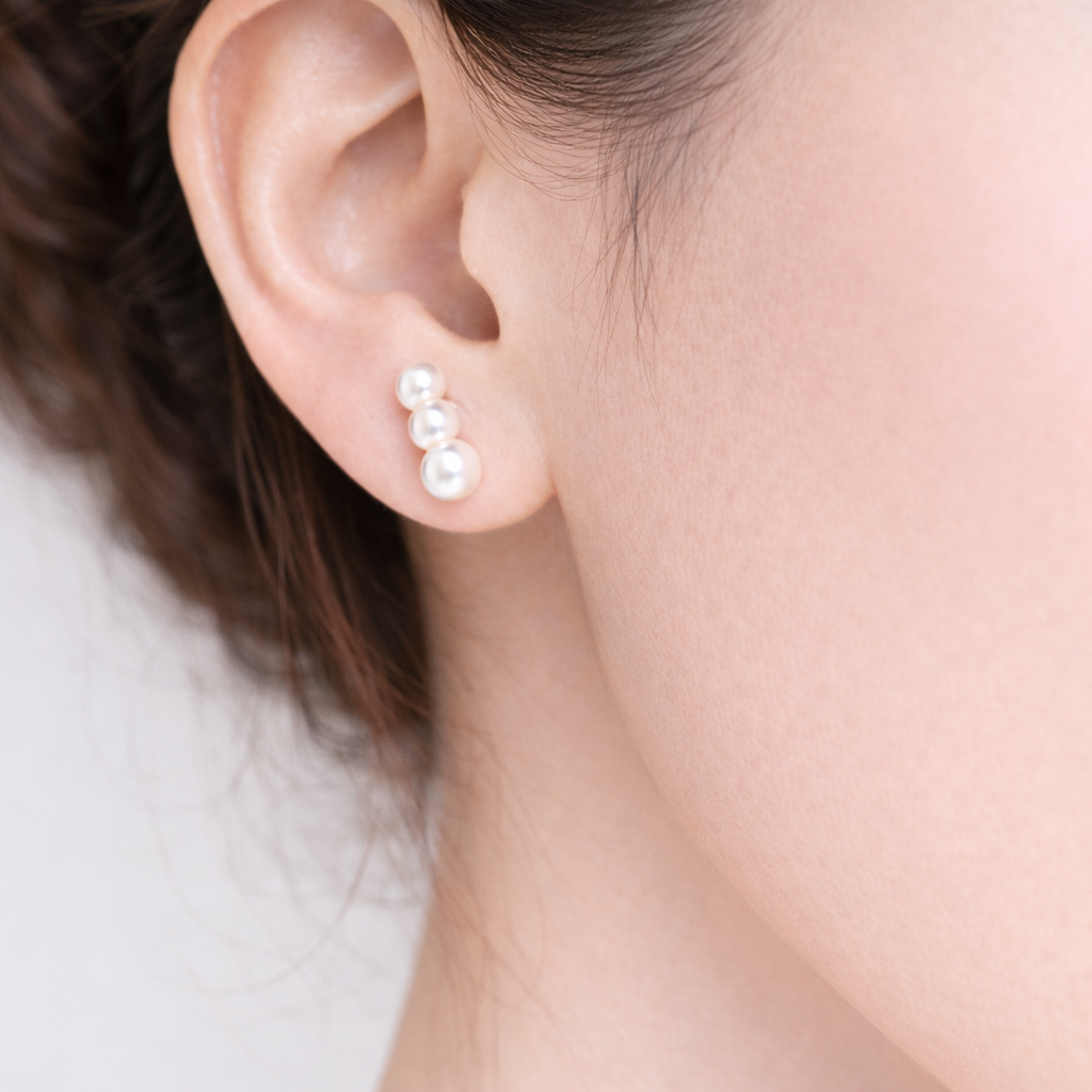 6.5mm〜7mmのアコヤ真珠を三粒あしらった、上品な三連イヤリング。
